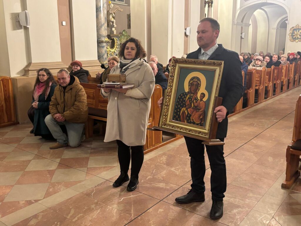 Ołtarz główny rokokowy z obrazem Matki Bożej Szkaplerznej w srebrnej sukience.