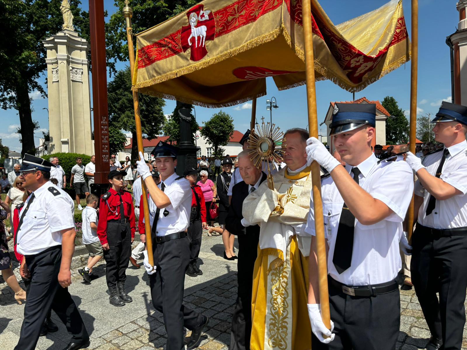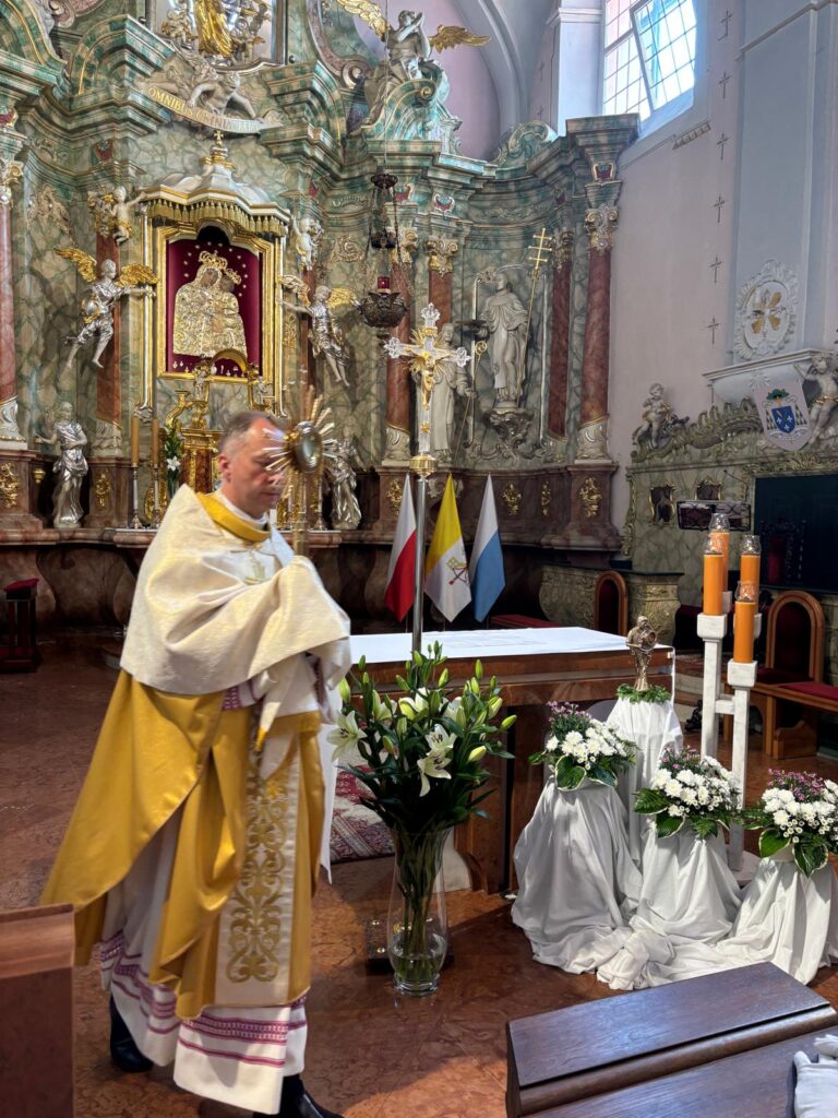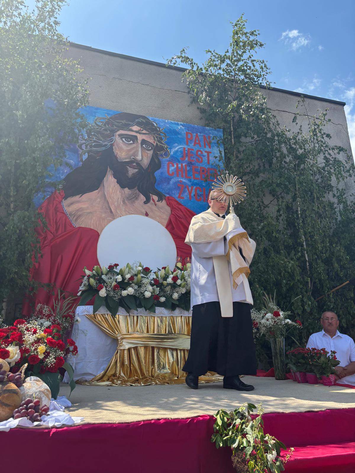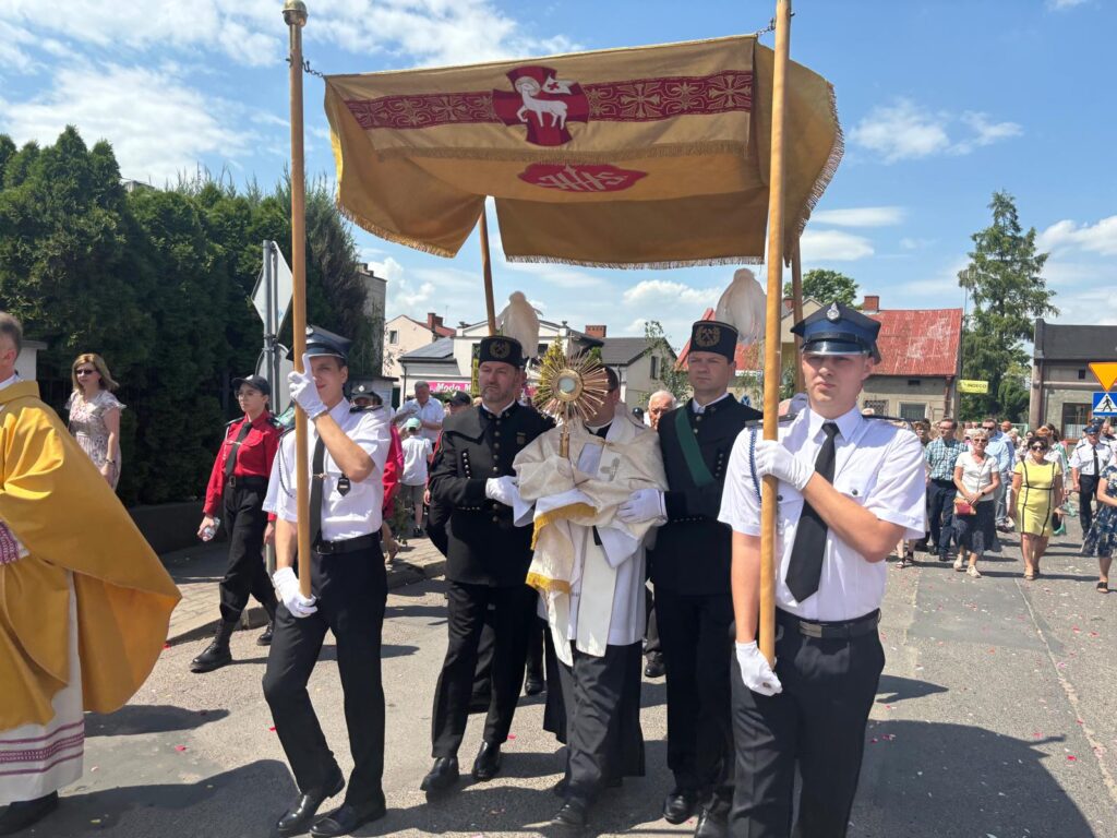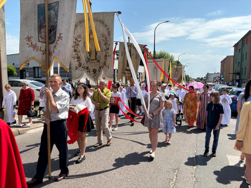 Uroczystość Bożego Ciała w naszej parafii rozpoczęła się Mszą świętą o godzinie 10:30. Podczas liturgii dzieci przystąpiły do Komunii Świętej rocznicowej. Do kościoła stawiły się poczty sztandarowe szkół, kopalni i straży pożarnych. Po Mszy św. wyruszyła procesja do czterech ołtarzy. Chór parafialny, asysta, strażacy, orkiestra górnicza, górnicy, grupy parafialne, służba liturgiczna, niosący feretrony, dzieci sypiące kwiatki – każdy przyczynił się do pięknego przebiegu uroczystości. Dziękujemy policji za zabezpieczenie trasy procesji.